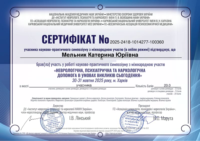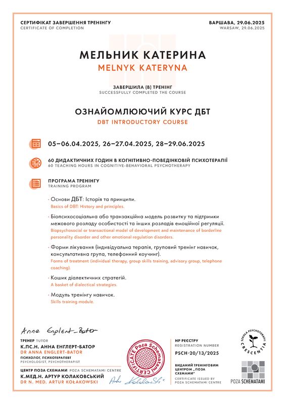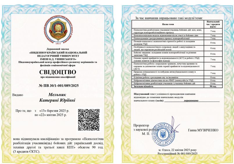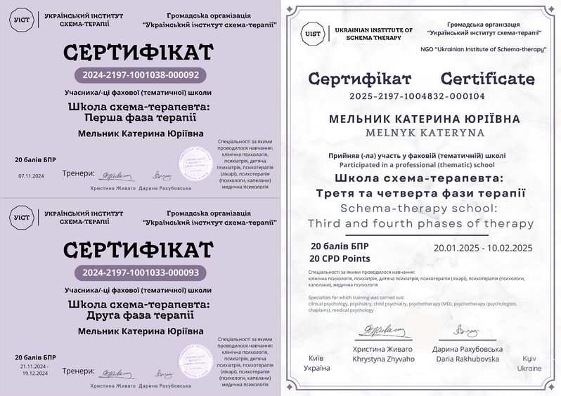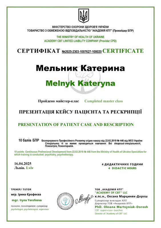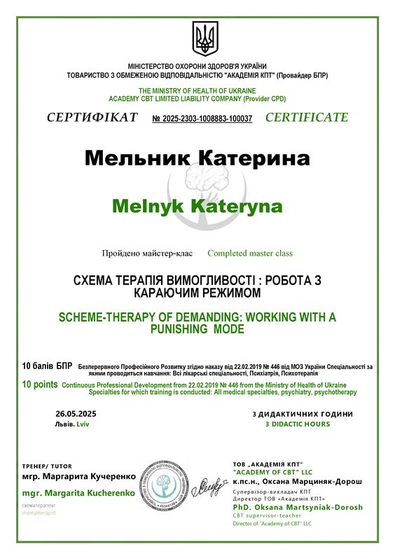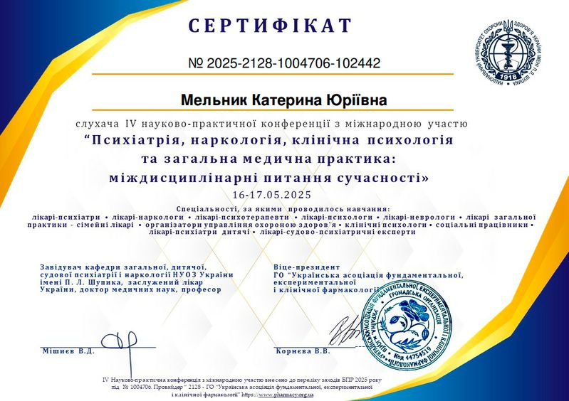 - Психотерапія, спеціаліст (ХНМУ, 2025).