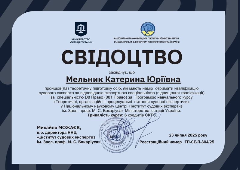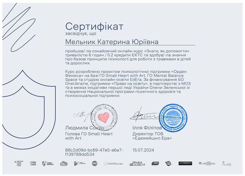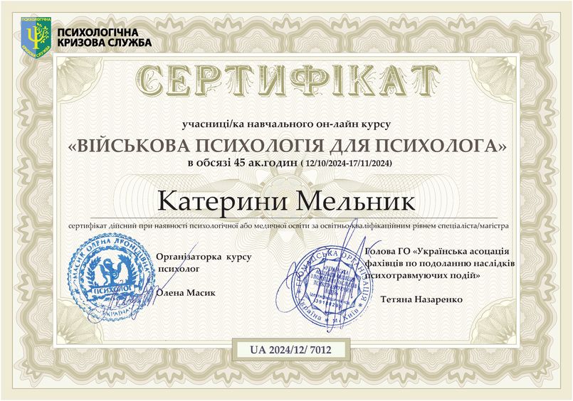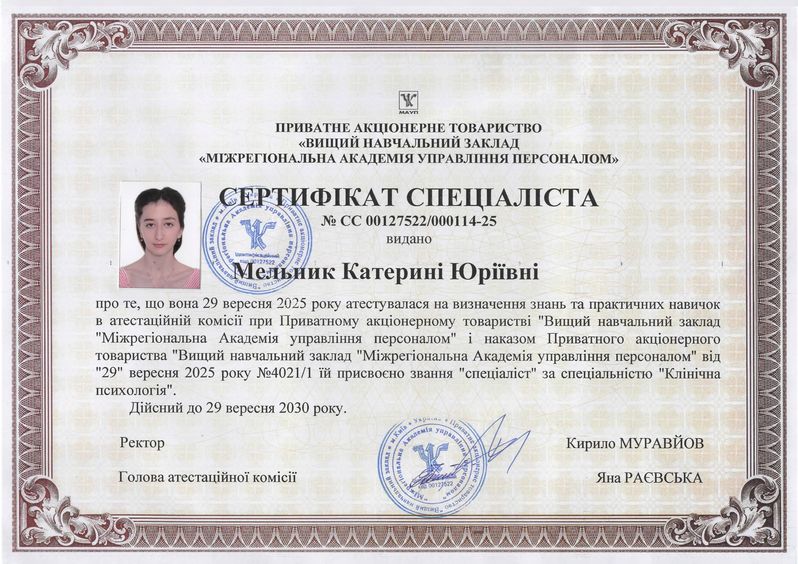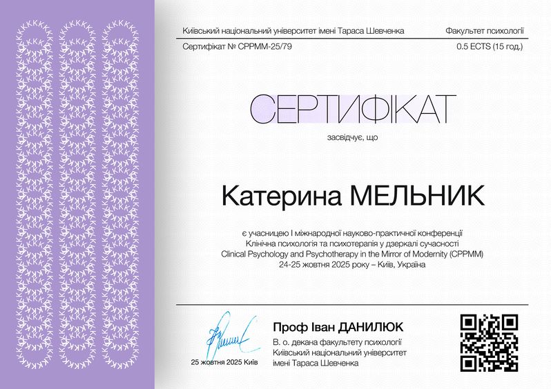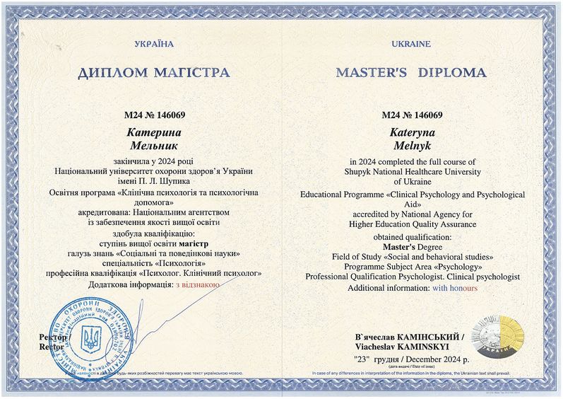 - Клінічна психологія, спеціаліст (КНУ ім. Т. Шевченка та МАУП, 2025).