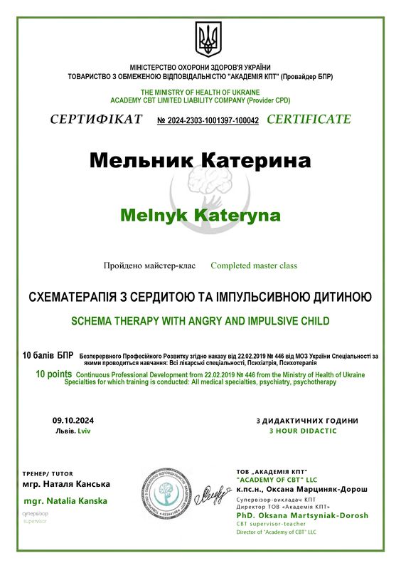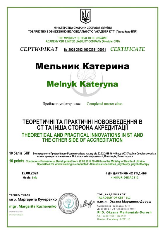 Курси: Розлади харчової поведінки: оцінка те терапевтичний супровід. Підготовка фахівців кризових інтервенцій та кризового консультування. Турбота про психічне здоров'я людей літнього віку (з основами КПТ). EFFT Essentials: акредитоване базове навчання в сімейній емоційно-фокусованій терапії. Розлади особистості: стратегії та терапевтичні моделі. Тики у дітей - інтегративний підхід. EFIT Essentials: акредитоване базове навчання в індивідуальній емоційно-фокусованій терапії. КПТ-модель консультування при поширених видах порушень сну. Схема-коучинг для дітей та підлітків (SCoach-CA) та схема-консультація для батьків (SCons-P). Теоретичні, організаційні і процесуальні питання судової експертизи. КПТ-модель розвитку навичок регуляції злості та тренінгу асретивності. Ознайомлюючий курс ДБТ. Інтеграція майндфулнес у консультування, коучинг та психотерапію. КПТ-модель плекання звичок здорового стилю життя. Когнітивно-поведінкові техніки для роботи з переконаннями та самооцінкою. Етична навігація в психотерапії. Наукова стаття з психології в журналі Q1: як провести, описати й опублікувати дослідження. Психологічна реабілітація учасників бойових дій: український досвід, техніки другої та третьої хвилі КПТ. КПТ-підхід у турботі про психічне здоров'я у перинатальному періоді. КПТ-модель консультування та супроводу при пережитті втрати. КПТ-підхід для коупінгу з професійним стресом та запобігання вигоранню. КПТ-модель менеджменту суїцидальності. Школа схема-терапевта. Основи психотравматології та травмафокусованої КПТ. КПТ-модель плекання психологічної стійкості. Майндфулнес (власний досвід). Військова психологія для психолога. Теорія і практика арт-терапії. Основи психоаналізу. Схема-терапія. Основи сексології та сексопатології. Основи сучасної психосоматики: психоаналітичний підхід. Психологічна допомога дітям: подолання травм війни, модель травма-фокусованої когнітивно-поведінкової терапії. Когнітивно-поведінкова терапія.