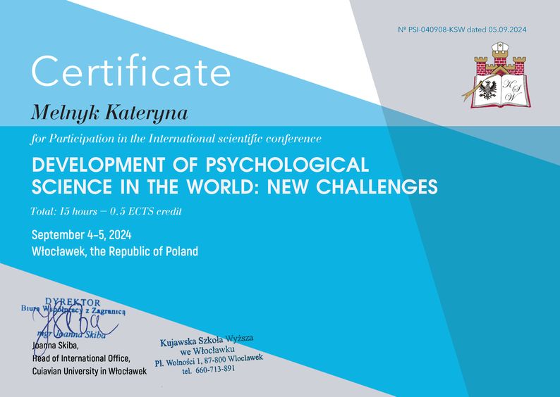 - Melnyk K. Yu. Psychological features of personality in psychoorganic syndrome and dementia. International scientific conference “Development of psychological science in the world: new challenges” : conference proceedings, Wloclawek, 4–5 September 2024. Riga, 2024. P. 9–12. https://doi.org/10.30525/978-9934-26-474-0-2