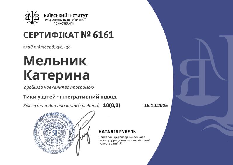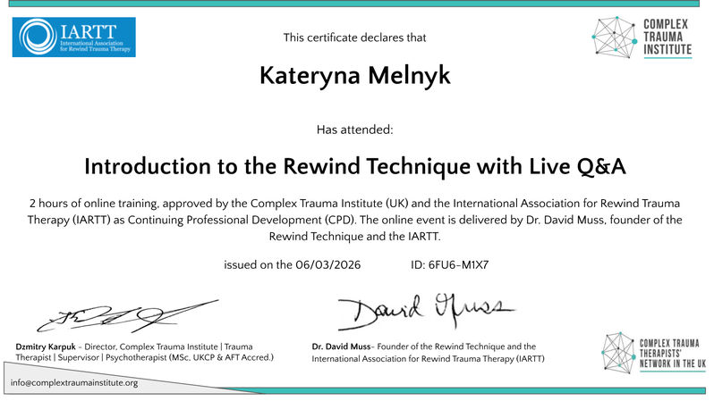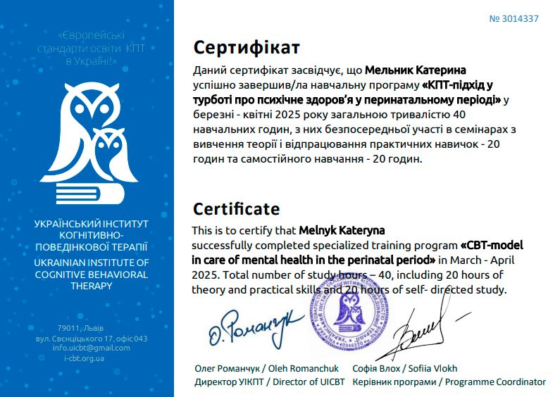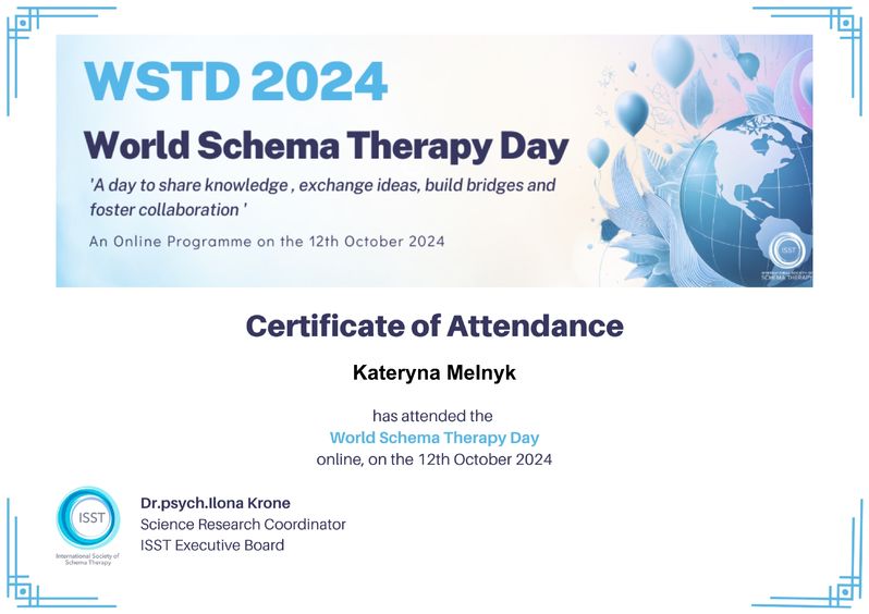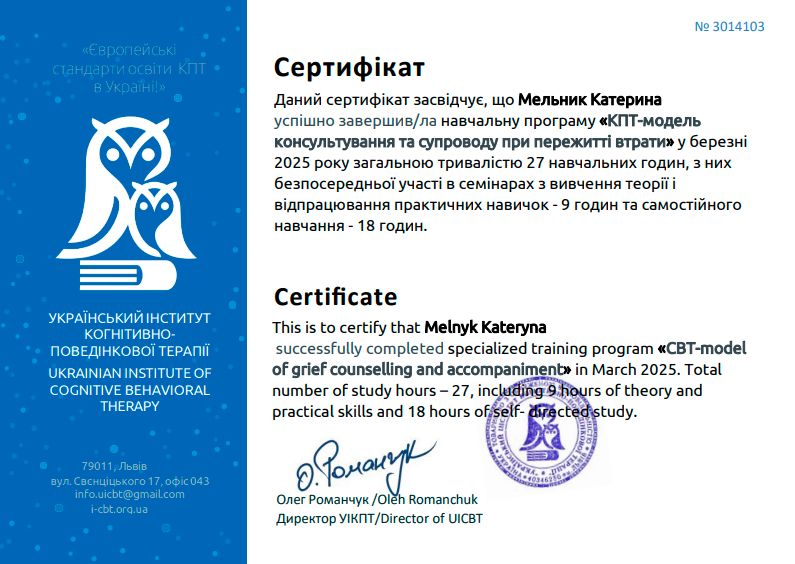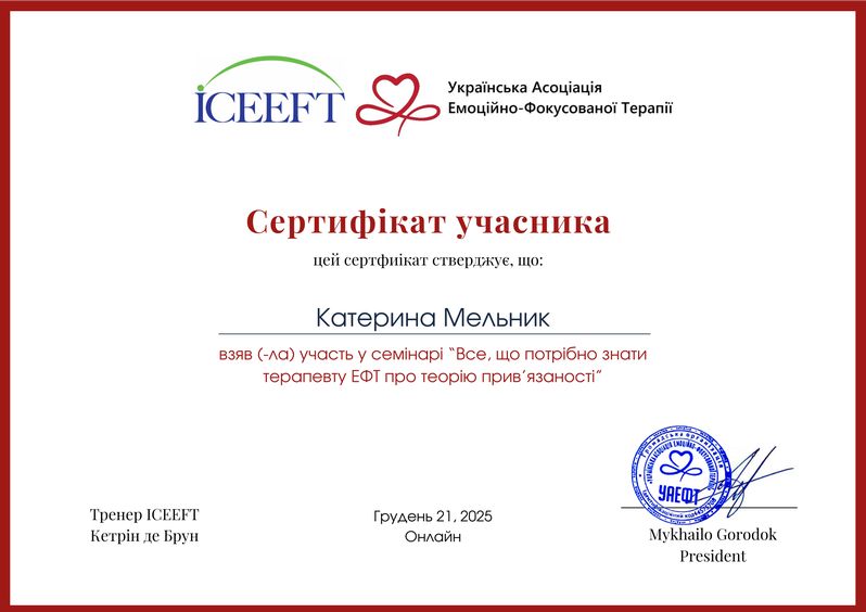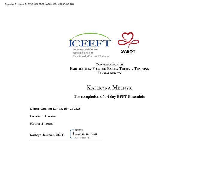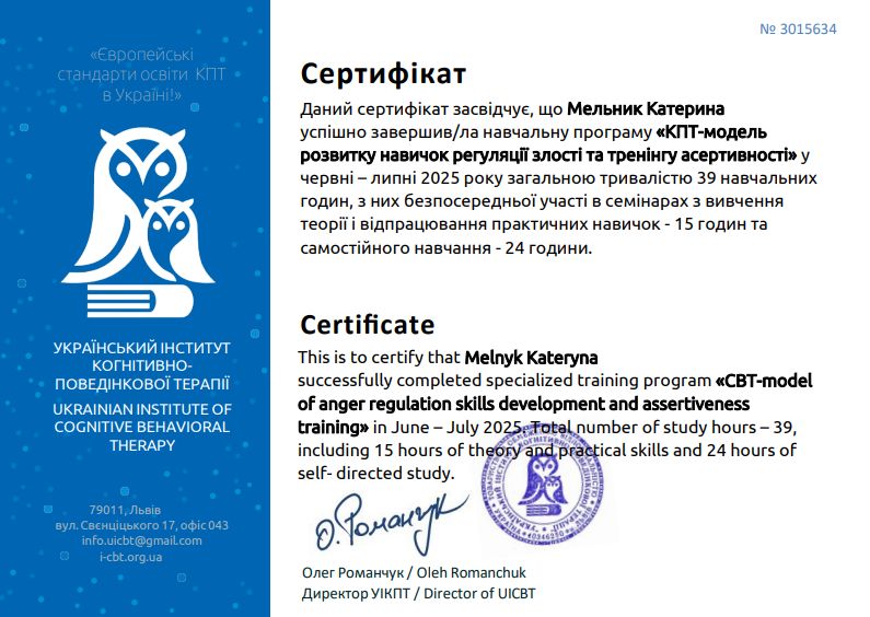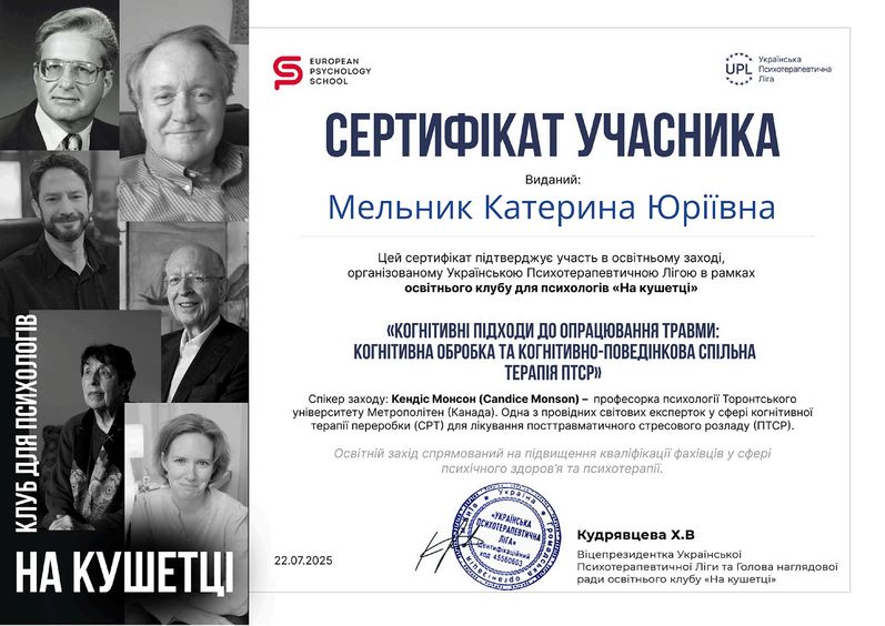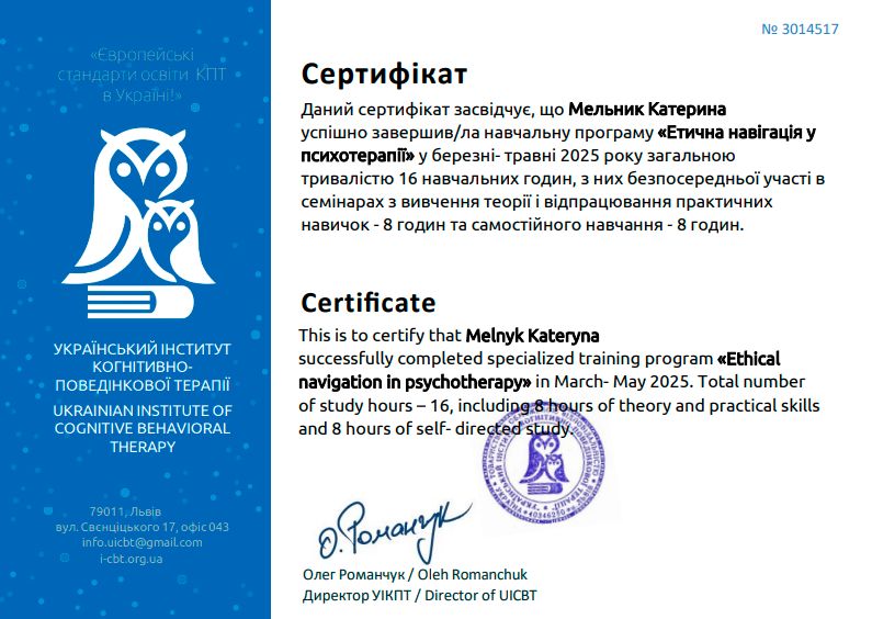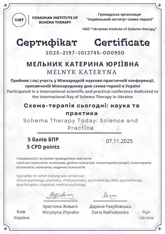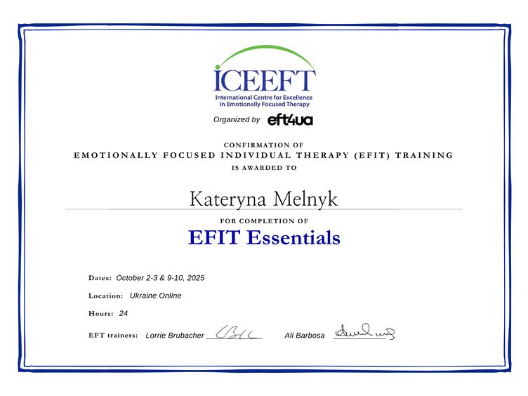 Член Української асоціації когнітивно-поведінкової терапії ✓, International Centre for Excellence in Emotionally Focused Therapy ✓ та International Society of Schema Therapy ✓.