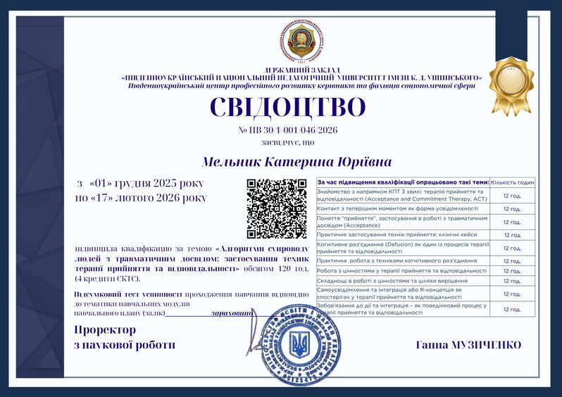 - Психотерапія, спеціаліст (ХНМУ, 2025).
