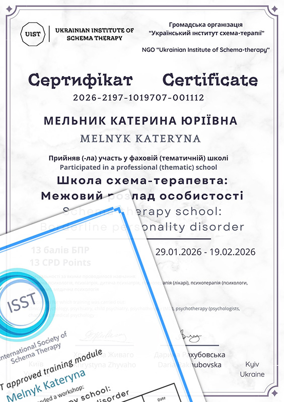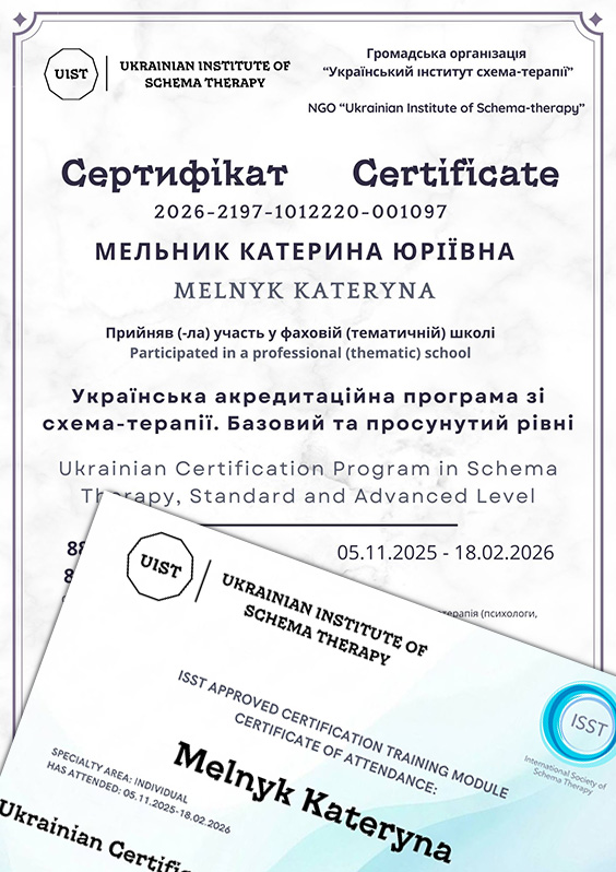 Член Української асоціації когнітивно-поведінкової терапії ✓, International Centre for Excellence in Emotionally Focused Therapy ✓ та International Society of Schema Therapy ✓.