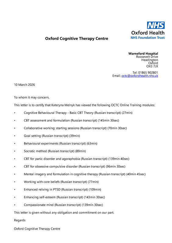 Курси: Онлайн-програма з КПТ Оксфордського центру когнітивної терапії. Школа схема-терапевта: Межовий розлад особистості. Українська акредитаційна програма зі схема-терапії. Алгоритми супроводу людей з травматичним досвідом: застосування технік терапії прийняття та відповідальності. Розлади харчової поведінки: оцінка те терапевтичний супровід. Підготовка фахівців кризових інтервенцій та кризового консультування. Турбота про психічне здоров'я людей літнього віку (з основами КПТ). EFFT Essentials: акредитоване базове навчання в сімейній емоційно-фокусованій терапії. Розлади особистості: стратегії та терапевтичні моделі. Тики у дітей - інтегративний підхід. EFIT Essentials: акредитоване базове навчання в індивідуальній емоційно-фокусованій терапії. КПТ-модель консультування при поширених видах порушень сну. Схема-коучинг для дітей та підлітків (SCoach-CA) та схема-консультація для батьків (SCons-P). Теоретичні, організаційні і процесуальні питання судової експертизи. КПТ-модель розвитку навичок регуляції злості та тренінгу асретивності. Ознайомлюючий курс ДБТ. Інтеграція майндфулнес у консультування, коучинг та психотерапію. КПТ-модель плекання звичок здорового стилю життя. Когнітивно-поведінкові техніки для роботи з переконаннями та самооцінкою. Етична навігація в психотерапії. Наукова стаття з психології в журналі Q1: як провести, описати й опублікувати дослідження. Психологічна реабілітація учасників бойових дій: український досвід, техніки другої та третьої хвилі КПТ. КПТ-підхід у турботі про психічне здоров'я у перинатальному періоді. КПТ-модель консультування та супроводу при пережитті втрати. КПТ-підхід для коупінгу з професійним стресом та запобігання вигоранню. КПТ-модель менеджменту суїцидальності. Школа схема-терапевта. Основи психотравматології та травмафокусованої КПТ. КПТ-модель плекання психологічної стійкості. Майндфулнес (власний досвід). Військова психологія для психолога. Теорія і практика арт-терапії. Основи психоаналізу. Схема-терапія. Основи сексології та сексопатології. Основи сучасної психосоматики: психоаналітичний підхід. Психологічна допомога дітям: подолання травм війни, модель травма-фокусованої когнітивно-поведінкової терапії. Когнітивно-поведінкова терапія.