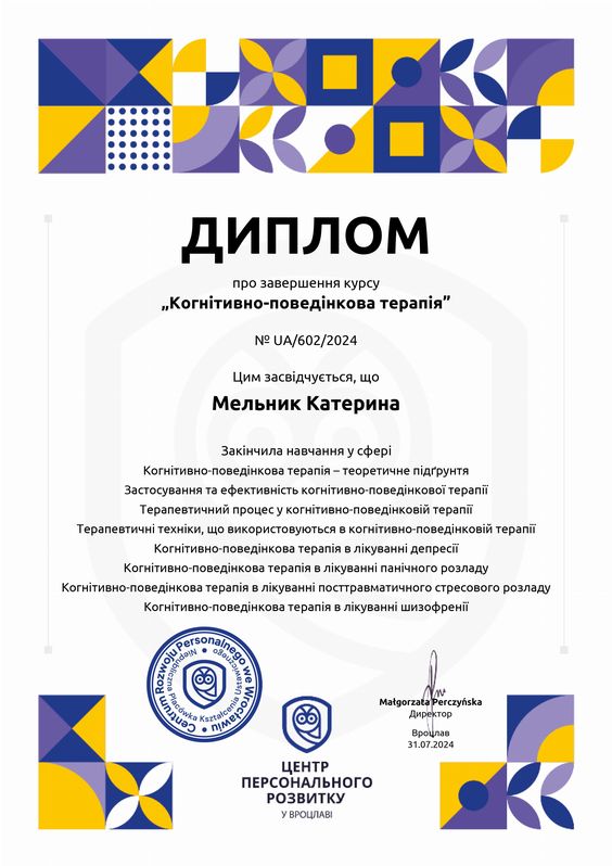Я использую только проверенные методы, которые уже доказали свою эффективность. Также важной частью процесса является выполнение домашней работы – упражнений и заданий. Но возможны случаи, когда между клиентом и психологом нет контакта. Это становится заметно в самом начале и в таком случае нужно искать "своего" терапевта. Это нормально.